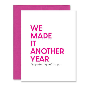 Each HUMOROUS 4.25"x 5.5" folded greeting card is digitally printed on bright white, thick card stock and comes with a bright pink A2 square flap envelope. Card wording: "WE MADE IT ANOTHER YEAR, Only eternity left to go" Blank Inside Packaged individually in a clear sleeve