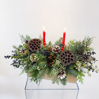 • In this hands-on floral workshop, you’ll learn step-by-step how to design a long, holiday textural centerpiece for your holiday table. We’ll guide you through floral ingredient selection, color balance, and arranging techniques to create a beautiful, artful design that reflects the season.