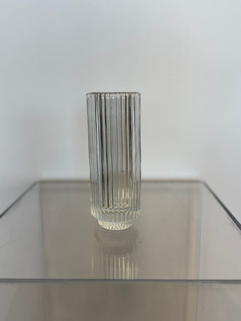 Crafted from clear ribbed glass with a refined vertical pleat design, this versatile piece beautifully diffuses candlelight, creating a warm and inviting glow. Its tall, structured shape makes it ideal for votive candles, tea lights, or as a bud vase for fresh or dried blooms.