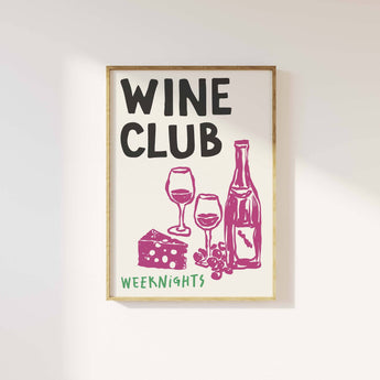For those who know the best meetings happen over a glass (or two). This bold, illustrated print features hand-drawn wine glasses, a bottle, grapes, and cheese with playful text reading “Wine Club – Weeknights.” A perfect addition to kitchens, dining rooms, or cozy bar nooks.