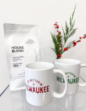 This gift box features a freshly roasted bag of Lake Effect Coffee Co. House Blend with tasting notes of grapefruit, clover honey, and toffee. Paired alongside is your choice of our “It’s Better in Milwaukee” or "It's Better in Wisconsin" ceramic mug in classic red and festive green.