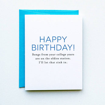 "HAPPY BIRTHDAY! Songs from your college years are on the oldies station. I'll let that sink in."