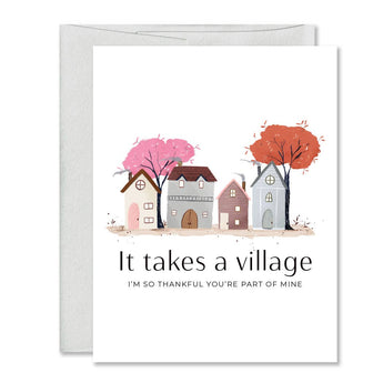 "IT TAKES A VILLAGE, I'm so thankful you're part of mine" paired with a charming illustration of a neighborhood street scene with homes and trees.