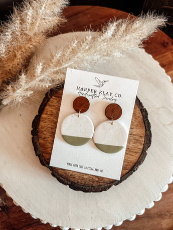 Handcrafted in Ridgeland, WI, these modern polymer clay earrings feature a warm two-tone design: speckled white paired with a rich mustard-gold accent. Finished with lightweight wood-patterned studs and hypoallergenic gold hardware, they offer an earthy, minimalist style that’s perfect for everyday wear or gifting. *Colors may slightly differ