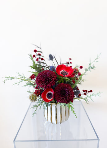 Meet the Garnet Bliss Arrangement, a rich and festive holiday design that brings warmth, depth, and seasonal charm to any space. Styled in our signature garden-inspired aesthetic, this arrangement features a lush mix of garnet-toned blooms paired with soft textural accents and fresh greenery for a striking, artful finish.