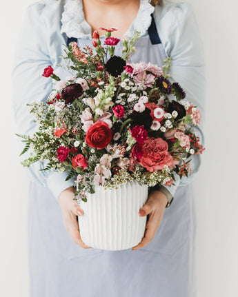 Our Valentine’s Haven Vase is a lush, romantic mix of dreamy pinks, reds, and soft berry tones. Designed in our signature modern garden style with airy movement and texture, this arrangement gives a just-picked feel. Arranged in a timeless white ribbed vase, this statement piece feels equal parts elevated and effortless—perfect for surprising someone you love (or treating yourself to a little everyday luxury).