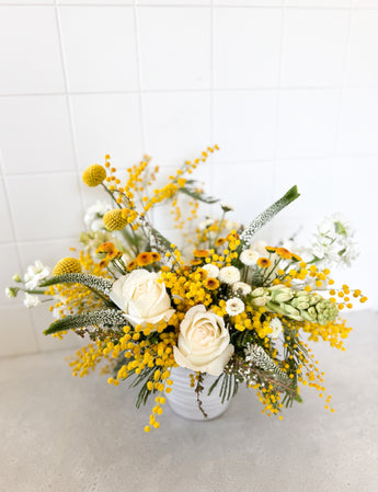 Celebration International Women's Day, Sunday March 8th! Our Mimosa Vase centerpiece is a classic, medium-sized arrangement. Featuring Mimosa acacia. Available for a limited time while in season. This fragrant design comes in a modern white pot. Reuse the pot to grow your favorite herbs or a plant. Send flowers to the important women in your life to celebrate! Order for pickup or delivery on Friday March 6th & Saturday March 7th.